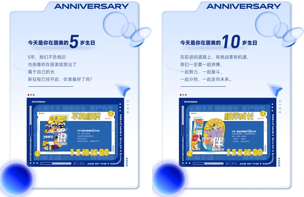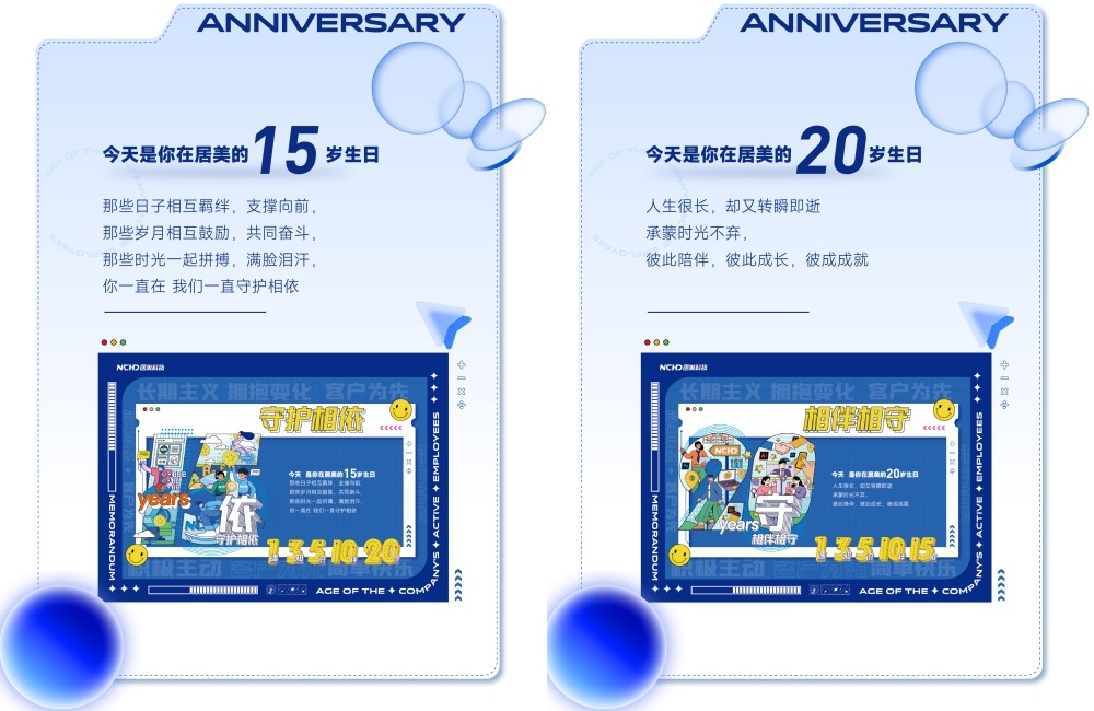所對應小伙伴們入職1年、3年、5年、10年、15年和20年
